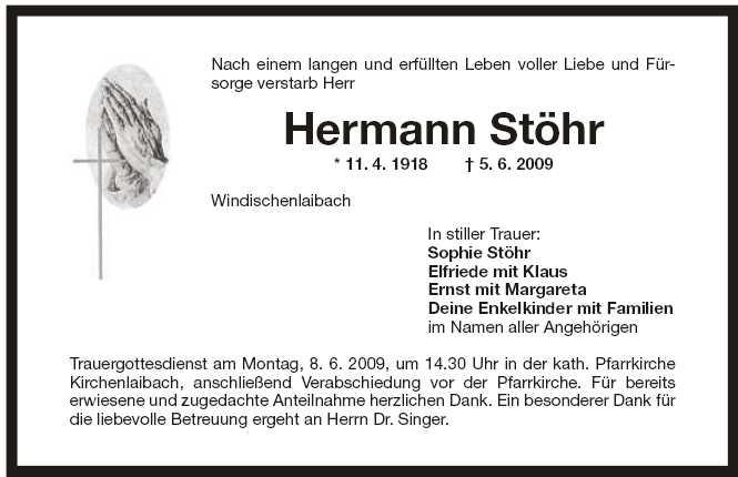 Der Trauergottesdienst mit anschließender Verabschiedung findet am Montag den 8.6.2009 um 14:30 Uhr in der Katholischen Pfarrkirche in Kirchenlaibach statt.
