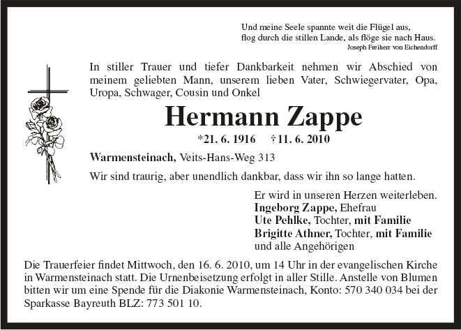 Die Trauerfeier findet Dienstag, den 16.6.2010, um 14.00 uhr in der evanglischen Kirche in Warmensteinach statt. Die Urnenbeisetzung erforlgt in aller Stille. Anstelle von Blumen bitten wir um eine Spende für die Diakonie Warmensteinach, Konto 570 340 034 bei der Sparkasse Bayreuth, BLZ 773 501 10