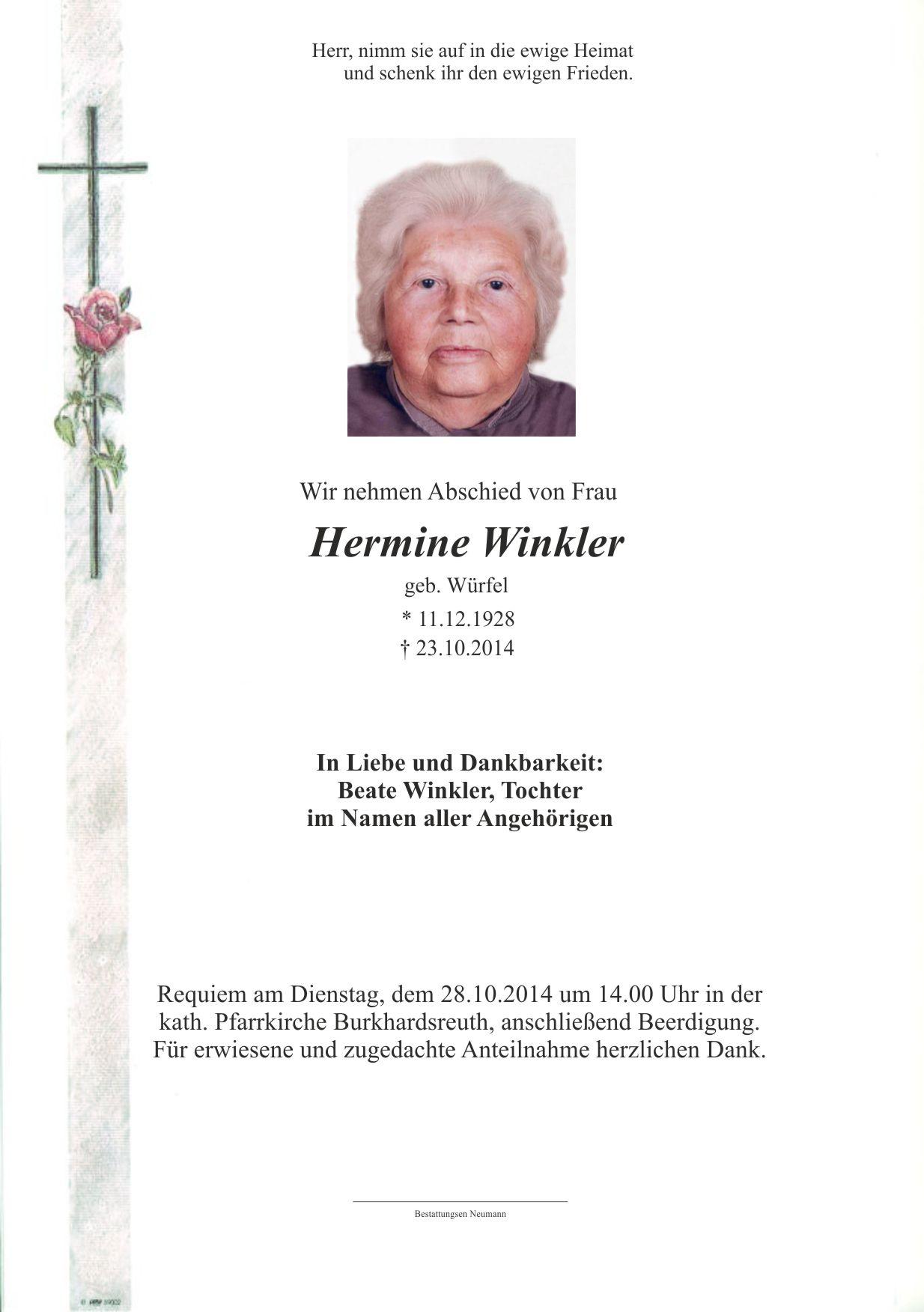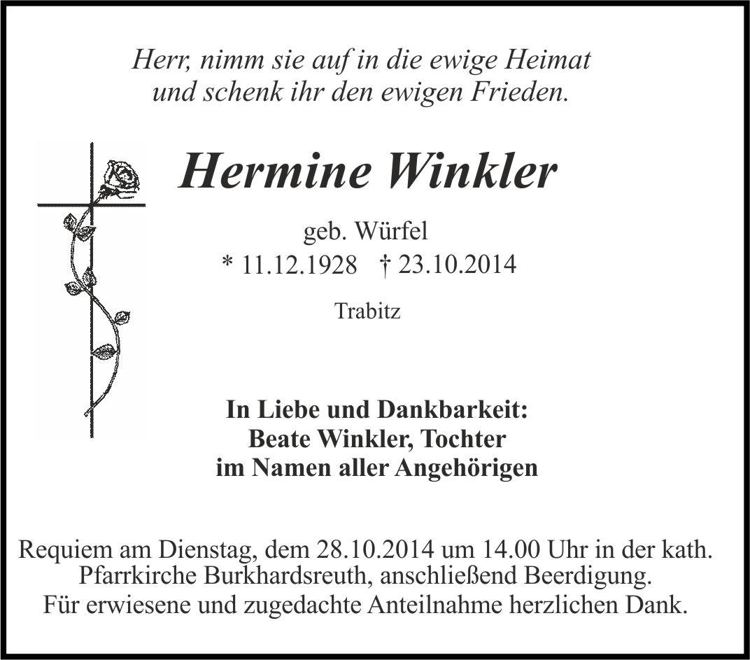 Requiem am Dienstag, den 28.10.2014, um 14.00 Uhr in der kath. Pfarrkirche Burkhardsreuth, anschließend Beerdigung auf dem Friedhof. Für bereits erwiesene und noch zugedachte Anteilnahme herzlichen Dank.