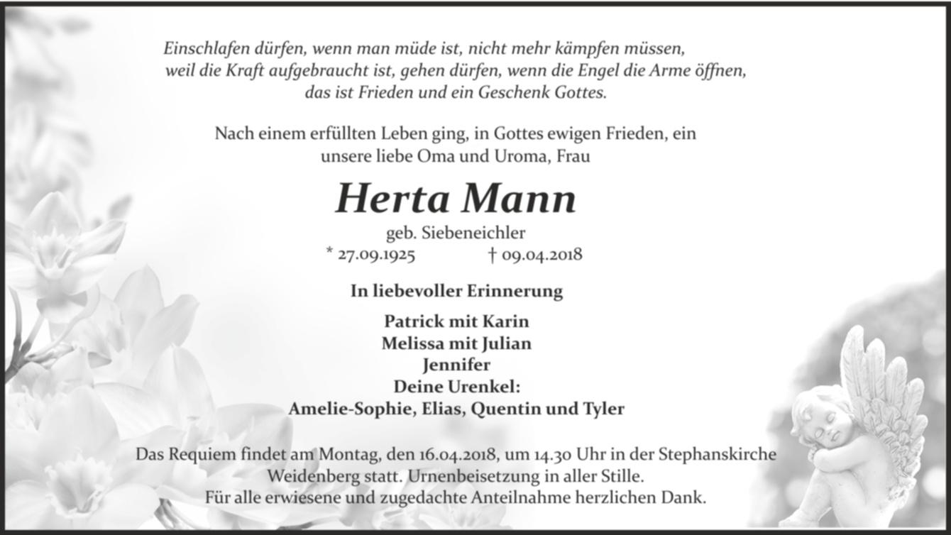 Der Trauergottesdienst findet am Montag, den 16.04.2018, um 14.30 Uhr in der Stephanskirche Weidenberg statt. Urnenbeisetzung in aller Stille. Für bereits erwiesene und noch zugedachte Anteilnahme herzlichen Dank.