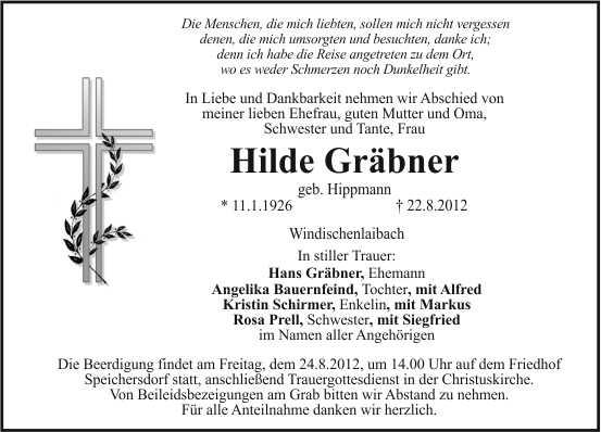 Die Beerdigung findet am Freitag, dem 24.8.2012, um 14.00 Uhr auf dem Friedhof Speichersdorf statt, anschließend Trauergottesdienst in der Christuskirche.