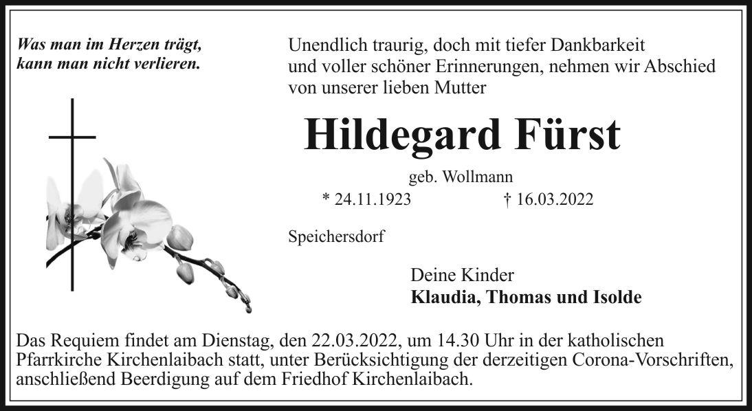 Das Requiem findet am Dienstag, den 22.03.2022, um 14.30 Uhr in der katholischen Pfarrkirche Kirchenlaibach statt, unter Berücksichtigung der derzeitigen Corona-Vorschriften, anschließend Beerdigung auf dem Friedhof Kirchenlaibach.