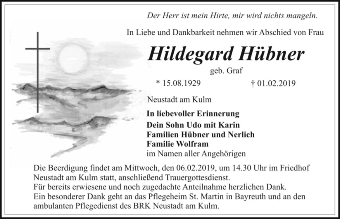 Die Beerdigung findet am Mittwoch, den 06.02.2019, um 14.30 Uhr im Friedhof Neustadt am Kulm statt, anschließend Trauergottesdienst. Für alle Anteilnahme herzlichen Dank.