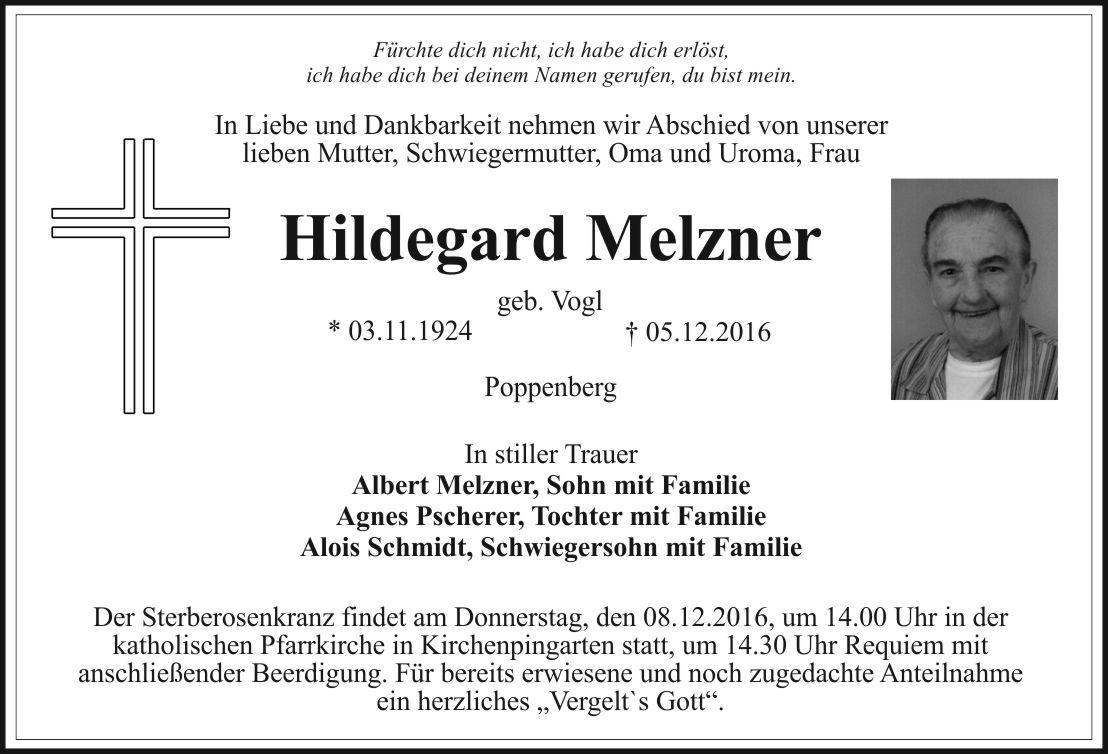 Der Sterberosenkranz findet am Donnerstag, den 08.12.2016, um 14.00 Uhr in der katholischen Pfarrkirche in Kirchenpingarten statt, um 14.30 Uhr Requiem mit anschließender Beerdigung. Für bereits erwiesene und noch zugedachte Anteilnahme ein herzliches „Vergelt`s Gott“.