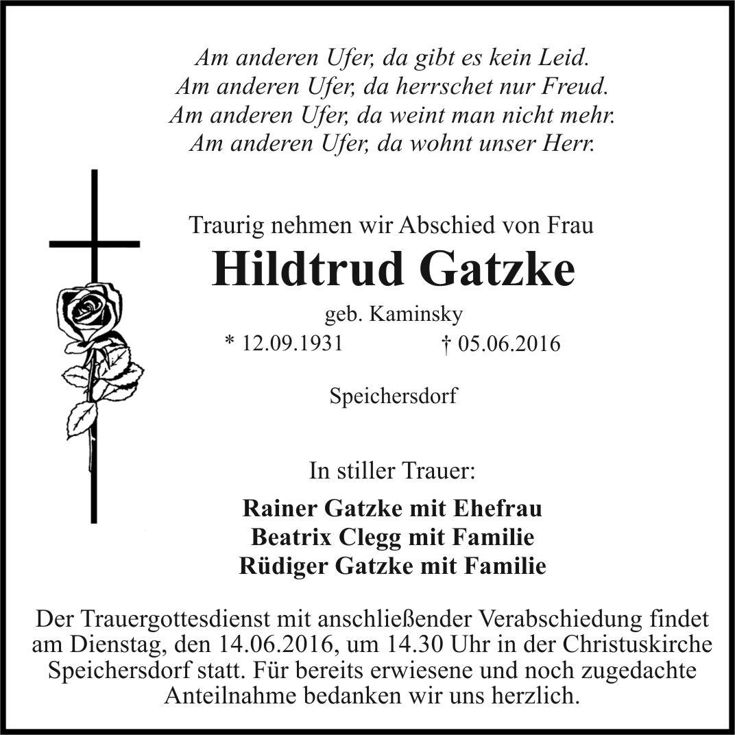 Der Trauergottesdienst mit anschließender Verabschiedung findet am Dienstag, den 14.06.2016, um 14.30 Uhr in der Christuskirche Speichersdorf statt. Für bereits erwiesene und noch zugedachte Anteilnahme bedanken wir uns herzlich.