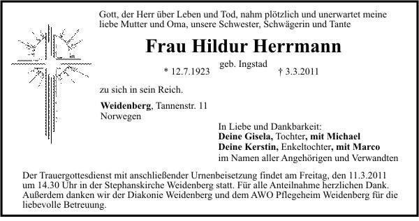 Die Beisetzung findet am Freitag, 11.03.2011 um 14:30 Uhr auf dem Friedhof in Weidenberg statt.