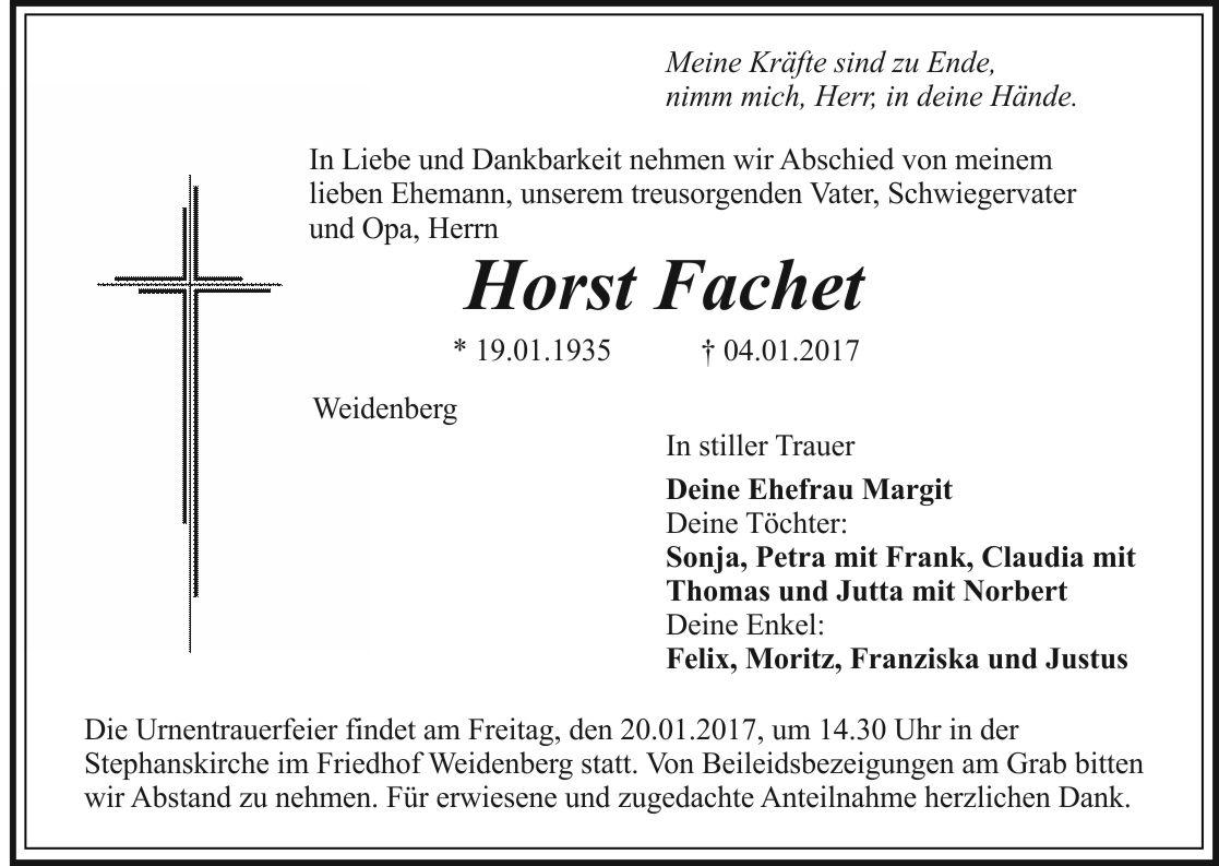 Die Urnentrauerfeier findet am Freitag, den 20.01.2017, um 14.30 Uhr in der Stephanskirche im Friedhof Weidenberg statt. Von Beileidsbezeigungen am Grab bitten wir Abstand zu nehmen. Für erwiesene und zugedachte Anteilnahme herzlichen Dank.