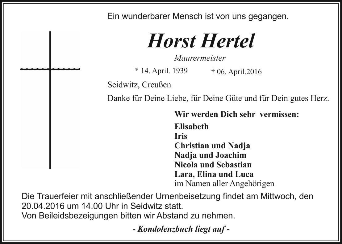 Die Trauerfeier mit anschließender Urnenbeisetzung findet am Mittwoch, den 20.04.2016 um 14.00 Uhr in Seidwitz statt.