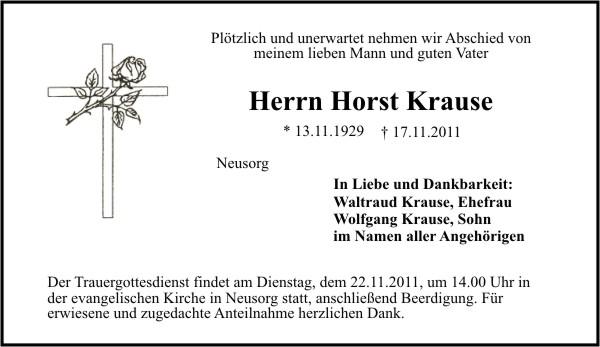 Der Trauergottesdienst findet am Dienstag, dem 22.11.2011, um 14.00 Uhr in der evangelischen Kirche in Neusorg statt, anschließend Beerdigung. Für erwiesene und zugedachte Anteilnahme herzlichen Dank.