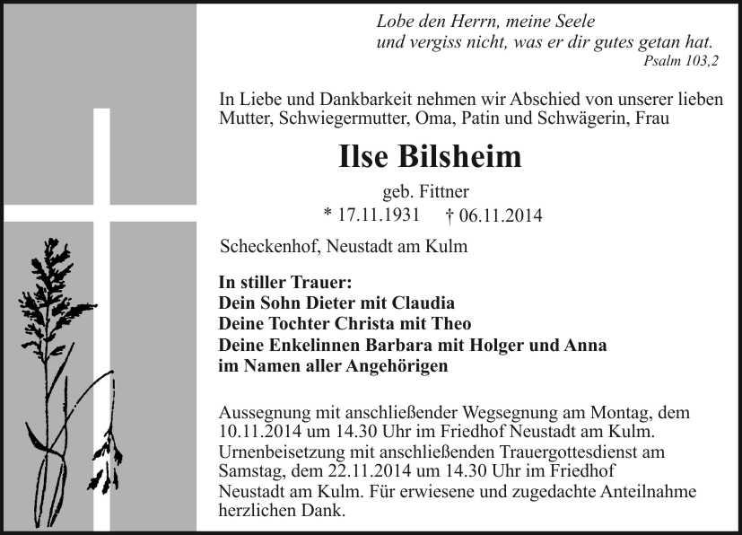 Aussegnung mit anschließender Wegsegnung am Montag, dem 10.11.2014 um 14.30 Uhr im Friedhof Neustadt am Kulm.