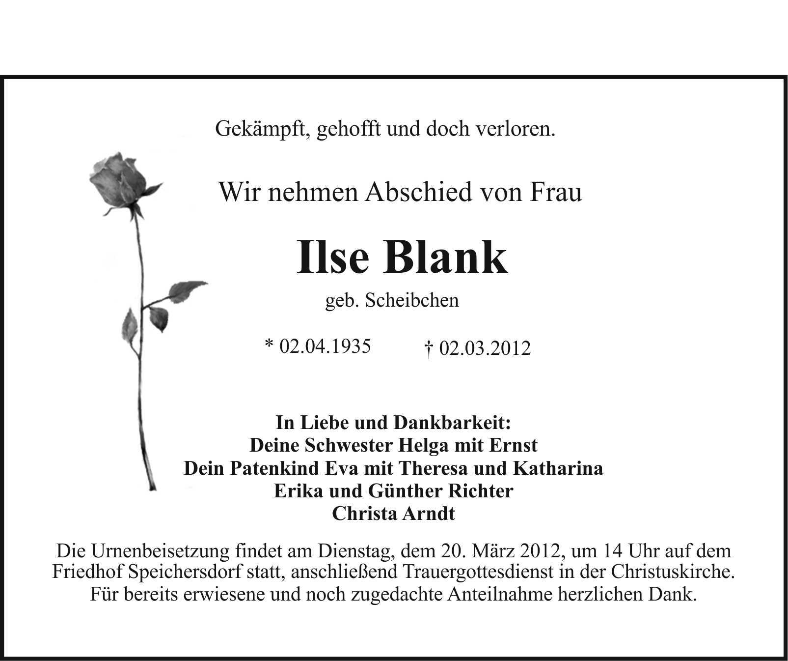 Urnenbeisetzung am Dienstag, dem 20.3.2012 um 14.00 Uhr auf dem Friedhof Speichersdorf, anschließend Trauergottesdienst in der Christuskirche Speichersdorf. Für alle Anteilnahme danken wir herzlich.