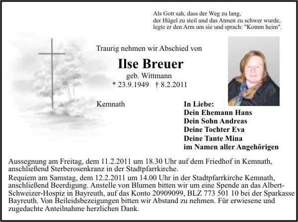 Die Beisetzung findet am Samstag, 12.02.2011 um 14:00 Uhr auf dem Friedhof in Kemnath statt.