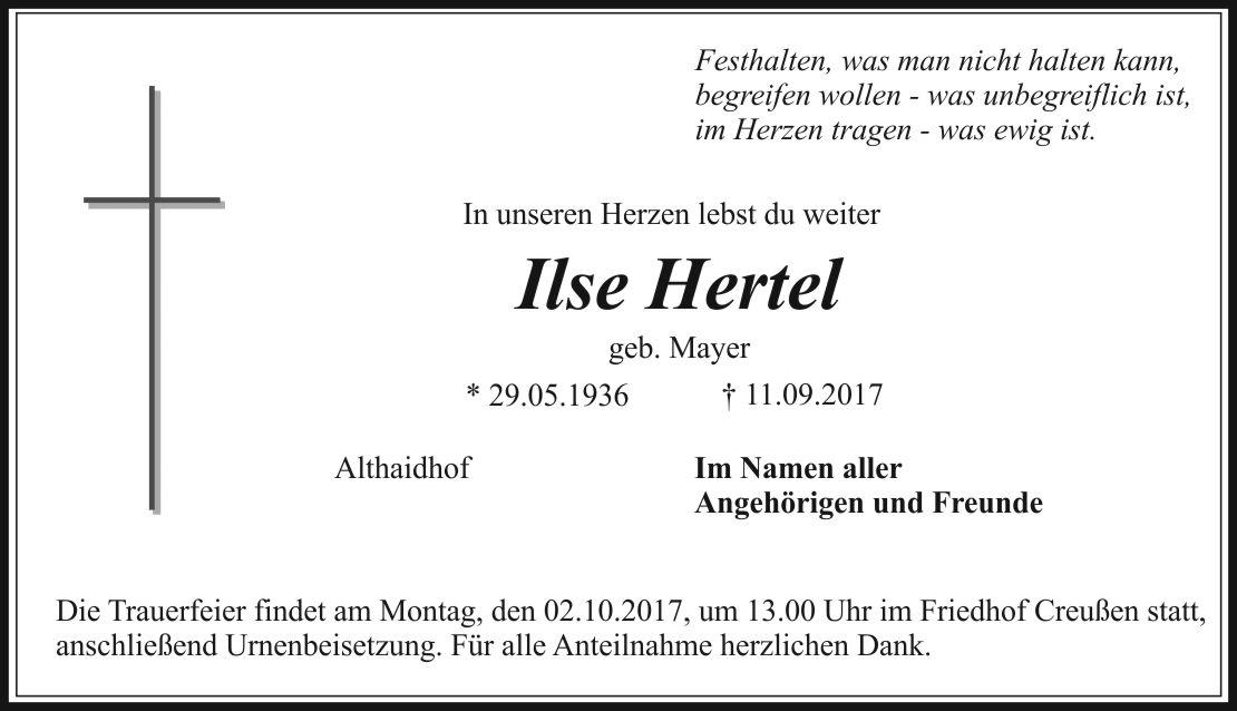 Die Trauerfeier findet am Montag, den 02.10.2017, um 13.00 Uhr im Friedhof Creußen statt,