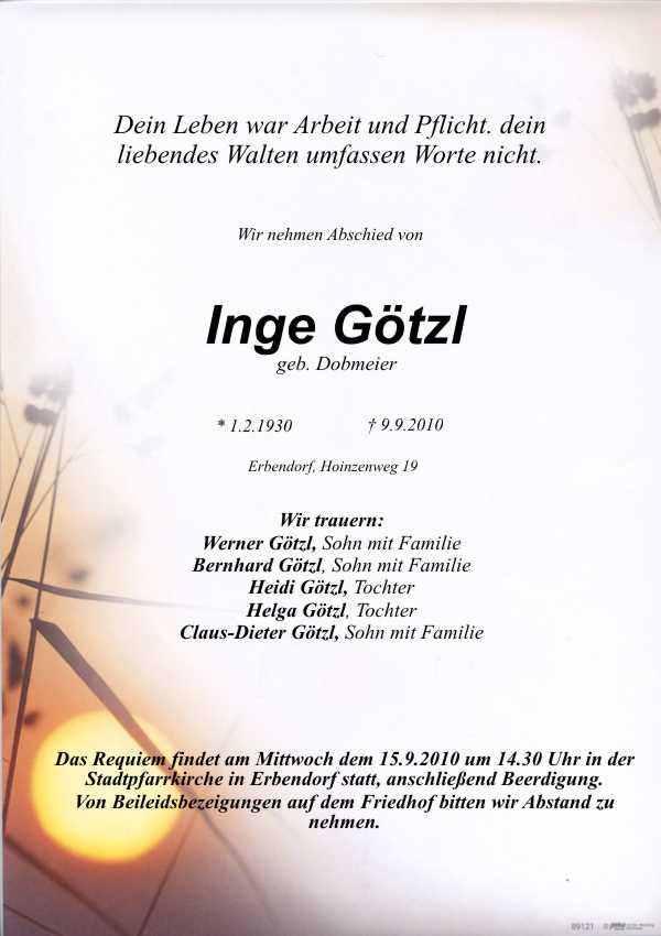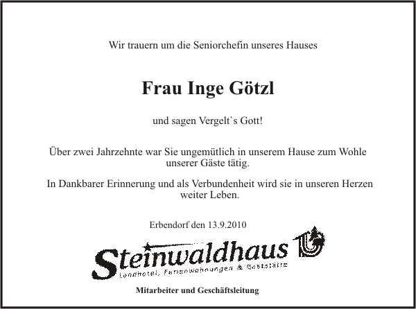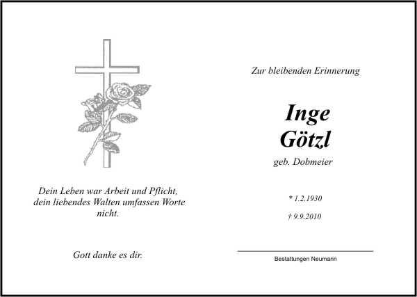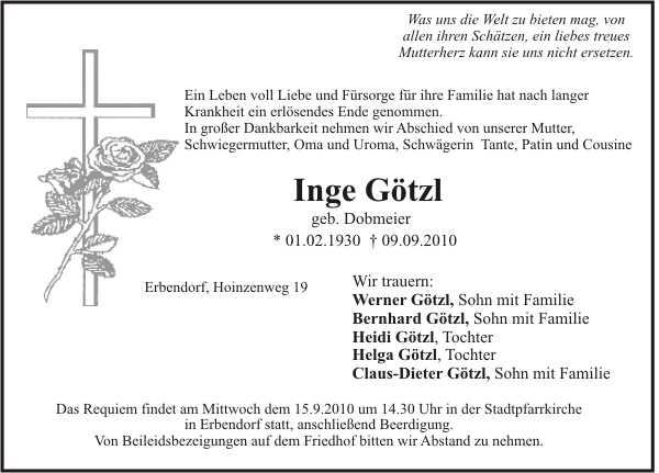 Das Requiem findet am Mittwoch dem 15.9.2010 um 14.30 Uhr in der Stadtpfarrkirche in Erbendorf statt, anschließend Beerdigung. Von Beileidsbezeigungen auf dem Friedhof bitten wir Abstand zu nehmen.