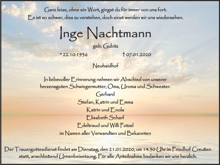 Der Trauergottesdienst findet am Dienstag, den 21.01.2020, um 14.30 Uhr im Friedhof Creußen statt, anschließend Urnenbeisetzung. Für alle Anteilnahme bedanken wir uns herzlich.
