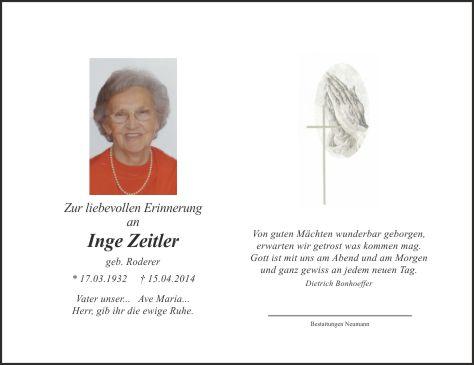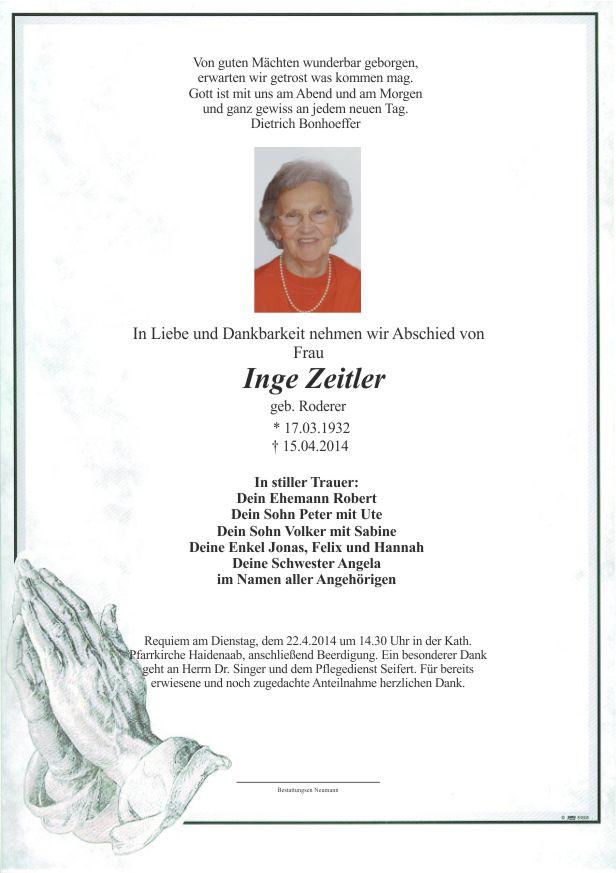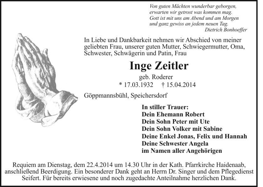 Requiem am Dienstag, dem 22.4.2014 um 14.30 Uhr in der Kath. Pfarrkirche Haidenaab, anschließend Beerdigung. Ein besonderer Dank geht an Herrn Dr. Singer und dem Pflegedienst Seifert. Für bereits erwiesene und noch zugedachte Anteilnahme herzlichen Dank.