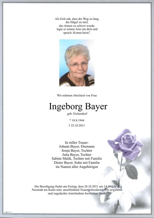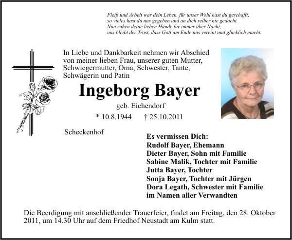 Die Beerdigung mit anschließender Trauerfeier, findet am Freitag, den 28. Oktober 2011, um 14.30 Uhr auf dem Friedhof Neustadt am Kulm statt.