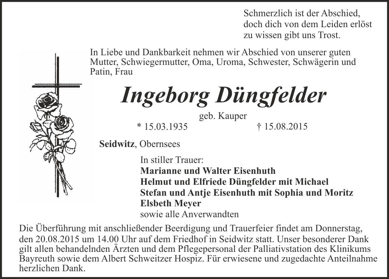 Überführung mit anschließender Beerdigung findet am Donnerstag, den 20.08.2015 um 14.00 Uhr auf dem Friedhof Seidwitz statt. Für erwiesene und zugedachte Anteilnahme herzlichen Dank.