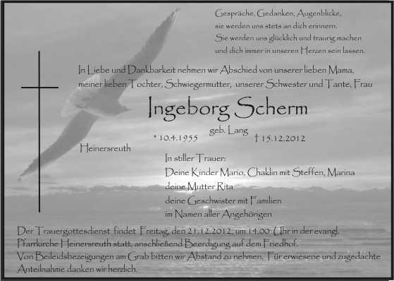 Der Trauergottesdienst findet Freitag, den 21.12.2012, um 14.00 Uhr in der evangl.
