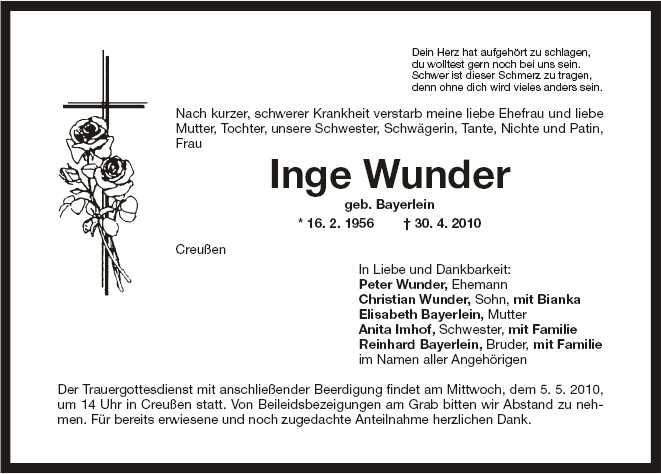 Die Beisetzung findet am Mittwoch, 05.05.2010 um 14:00 Uhr auf dem Friedhof in Creußen statt.