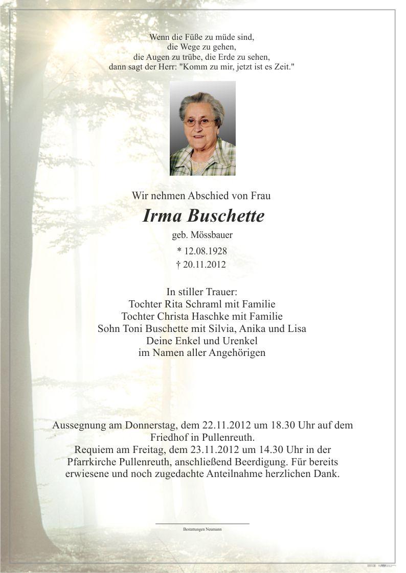 Requiem am Freitag, dem 23.11.2012 um 14.30 Uhr in der Pfarrkirche Pullenreuth, anschließend Beerdigung. Für bereits erwiesene und noch zugedachte Anteilnahme herzlichen Dank.