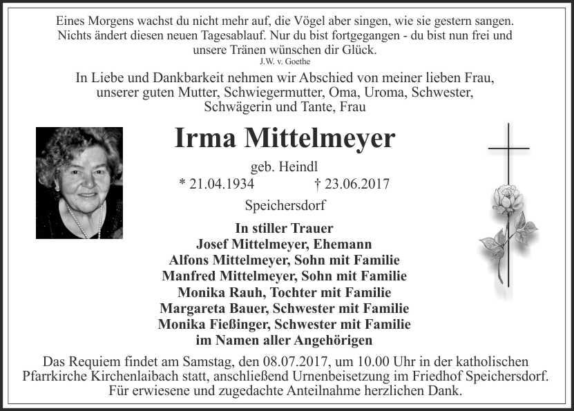 Die Beisetzung findet am Samstag, 08.07.2017 um 10:00 Uhr auf dem Friedhof in Kirchenlaibach statt.