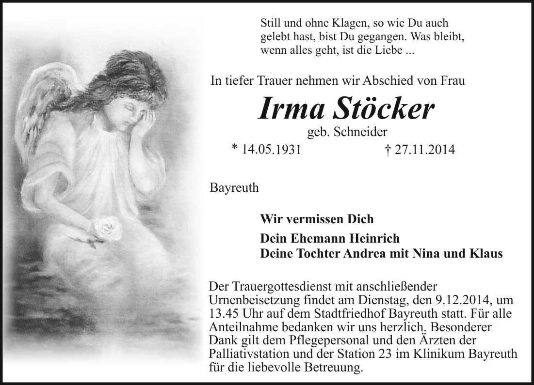 Der Trauergottesdienst mit anschließender Urnenbeisetzung findet am Dienstag, den 9.12.2014, um 13.45 Uhr auf dem Stadtfriedhof Bayreuth statt. Für alle Anteilnahme bedanken wir uns herzlich. Besonderer Dank gilt dem Pflegepersonal und den Ärzten der Palliativstation und der Station 23 im Klinikum Bayreuth für die liebevolle Betreuung.