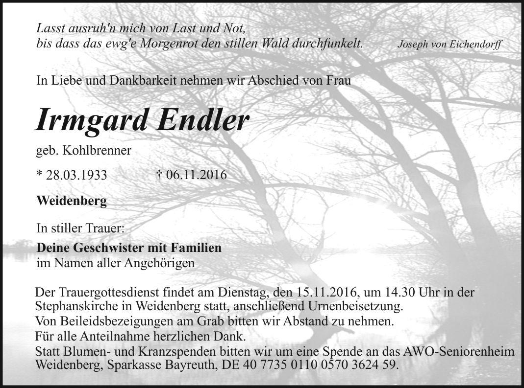 Statt Blumen- und Kranzspenden bitten wir um eine Spende an das AWO-Seniorenheim Weidenberg, Sparkasse Bayreuth, DE 40 7735 0110 0570 3624 59.