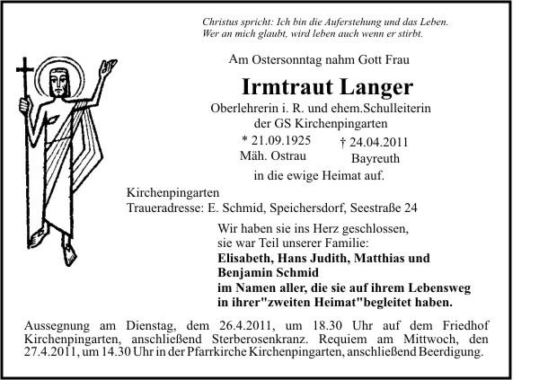 Die Beisetzung findet am Mittwoch, 27.04.2011 um 14:30 Uhr auf dem Friedhof in Kirchenpingarten statt.