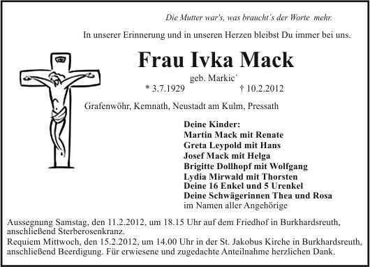 Requiem Mittwoch, den 15.2.2012, um 14.00 Uhr in der St. Jakobus Kirche in Burkhardsreuth, anschließend Beerdigung. Für erwiesene und zugedachte Anteilnahme herzlichen Dank.