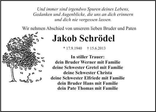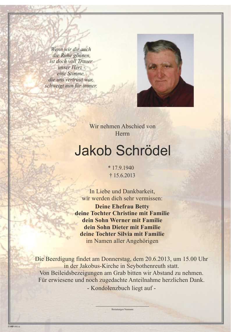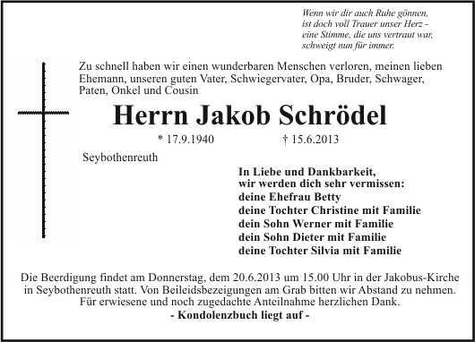 Die Beerdigung findet am Donnerstag, dem 20.6.2013 um 15.00 Uhr in der Jakobus-Kirche in Seybothenreuth statt. Von Beileidsbezeigungen am Grab bitten wir Abstand zu nehmen. Für erwiesene und noch zugedachte Anteilnahme herzlichen Dank.