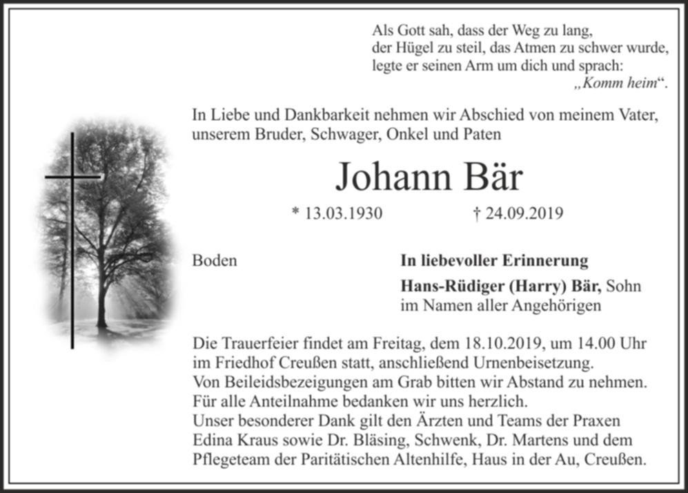 Die Trauerfeier mit anschließender Urnenbeisetzung findet am Freitag, den 18.10.2019, um 14.00 Uhr im Friedhof Creußen statt. Für alle Anteilnahme herzlichen Dank.