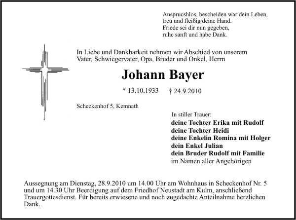 Die Beisetzung findet am Dienstag, 28.09.2010 um 14:30 Uhr auf dem Friedhof in Neustadt am Kulm statt.