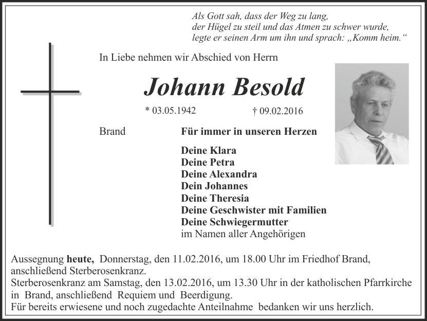 Die Aussegnung findet am Donnerstag, den 11.2.2016, um 18.00 Uhr im Friedhof Brand statt, anschließend Sterberosenkranz in der katholischen Pfarrkirche Brand.