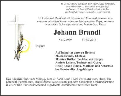 Das Requiem findet am Montag, dem 23.9.2013, um 15.00 Uhr in der kath. Herz Jesu Kirche in Pegnitz statt, anschließend Wegsegnung auf dem Kirchplatz. Urnenbeisetzung in aller Stille. Für erwiesene und zugedachte Anteilnahme herzlichen Dank.