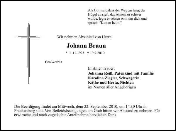 Die Beisetzung findet am Mittwoch, 22.09.2010 um 14:30 Uhr auf dem Friedhof in Frankenberg statt.