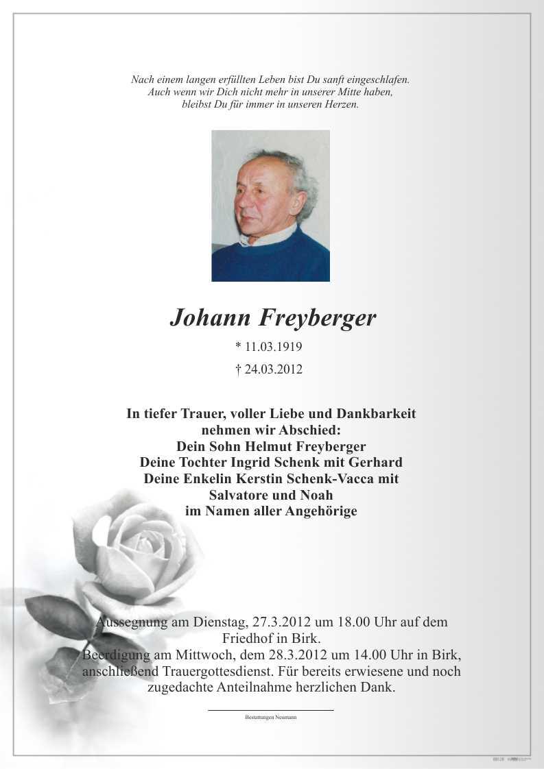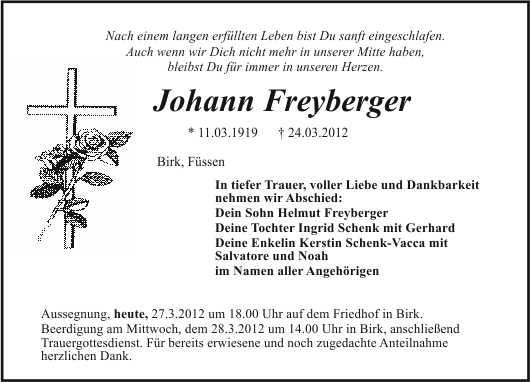 Beerdigung am Mittwoch, dem 28.3.2012 um 14.00 Uhr in Birk, anschließend Trauergottesdienst. Für bereits erwiesene und noch zugedachte Anteilnahme herzlichen Dank.