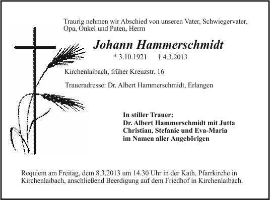 Requiem am Freitag, dem 8.3.2013 um 14.30 Uhr in der Kath. Pfarrkirche in Kirchenlaibach, anschließend Beerdigung auf dem Friedhof in Kirchenlaibach.