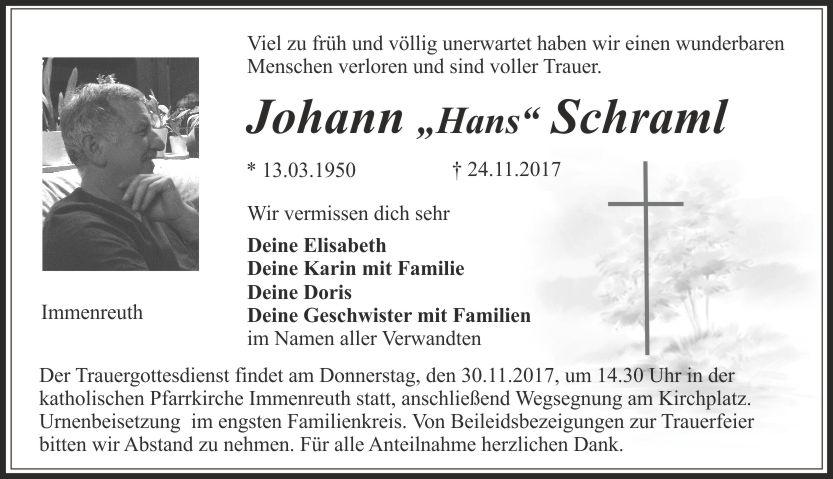 Der Trauergottesdienst findet am Donnerstag, den 30.11.2017, um 14.30 Uhr in der katholischen Pfarrkirche Immenreuth statt, anschließend Wegsegnung am Kirchplatz. Urnenbeisetzung im engsten Familienkreis. Von Beileidsbezeigungen zur Trauerfeier bitten wir Abstand zu nehmen. Für alle Anteilnahme herzlichen Dank.