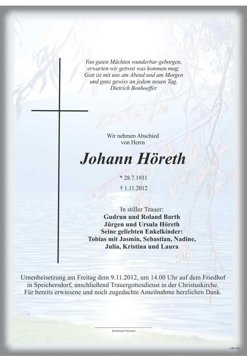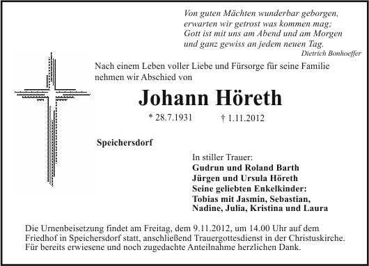Die Urnenbeisetzung findet am Freitag, dem 9.11.2012, um 14.00 Uhr auf dem Friedhof in Speichersdorf statt, anschließend Trauergottesdienst in der Christuskirche.