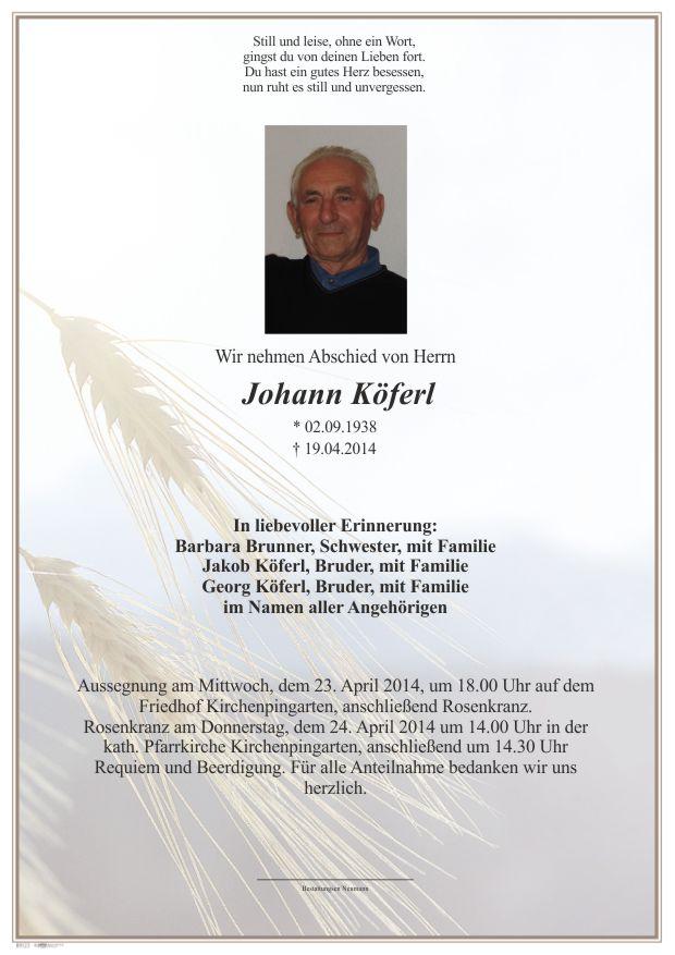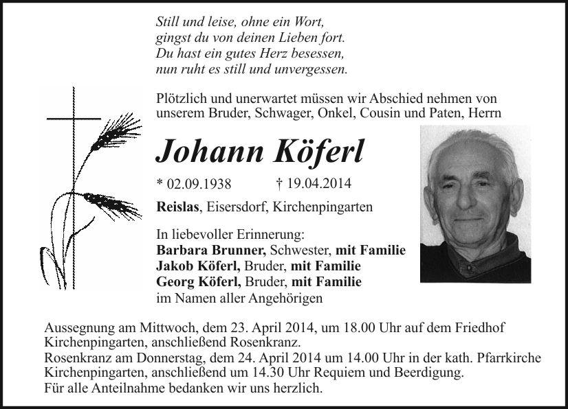Rosenkranz am Donnerstag, dem 24. April 2014 um 14.00 Uhr in der kath. Pfarrkirche Kirchenpingarten, anschließend um 14.30 Uhr Requiem und Beerdigung.