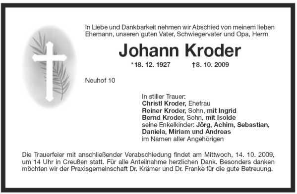 Die Trauerfeier mit anschließender Verabschiedung findet am Mittwoch, dem 14.10.2009 um 14.00 Uhr in Creußen statt.