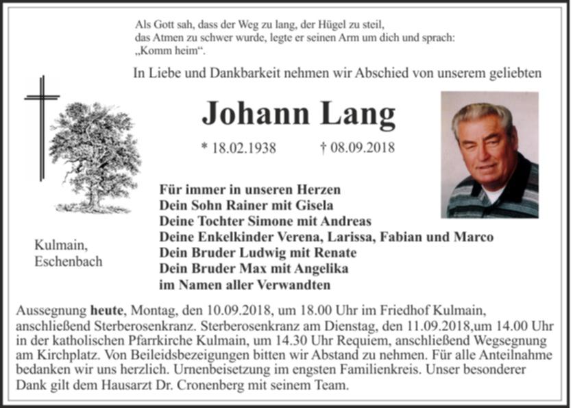 anschließend Sterberosenkranz. Sterberosenkranz am Dienstag, den 11.09.2018,um 14.00 Uhr in der katholischen Pfarrkirche Kulmain, um 14.30 Uhr Requiem, anschließend Wegsegnung am Kirchplatz. Von Beileidsbezeigungen bitten wir Abstand zu nehmen. Für alle Anteilnahme bedanken wir uns herzlich. Urnenbeisetzung im engsten Familienkreis. Unser besonderer