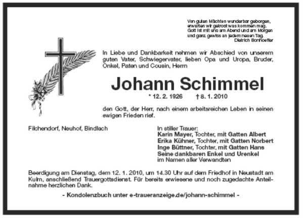 Wir trauern um unseren Freund und "Eierlieferanten" Hans Schimmel. Als ich von 1965-1973 Pfarrer in Neustadt am Kulm war und er Bürgermeister in Filchendorf, arbeiteten wir gut zusammen. Wir beide bauten nach Schließung der Volksschule in Filchendorf diese Schule zu einem Ganztagskindergarten um. Das war damals eine große Sache, es war eine der ersten Kindergärten auf dem Lande. Die Zusammenarbeit war immer freundschaftlich. Aber wir waren noch aus einem anderen Grund befreundet. 1969 gründeten wir in Filchendorf den Skatclub Contra-Ré. Jeden Dienstag - später jeden Montag - kamen wir jede Woche zusammen, um einen zünftigen Skat zu spielen. Er war ein fairer und auch "scharfer" Kartler, aber auch ein guter und fairer Verlierer. Ich habe gerne mit ihm zusammen gespielt. Und natürlich sind wir uns bei dem jahrzehntelangen Spielen auch familiär näher gekommen. Seinen 80. Geburtstag haben wir noch in großer Runde gefeiert. Meine Frau und ich sprechen den drei Töchtern mit ihren Familien unser herzliches Beileid aus. Gerne werden wir uns an unseren Hans Schimmel erinnern. Gott möge ihn in sein himmlisches Reich aufnehmen. Uli und Maria