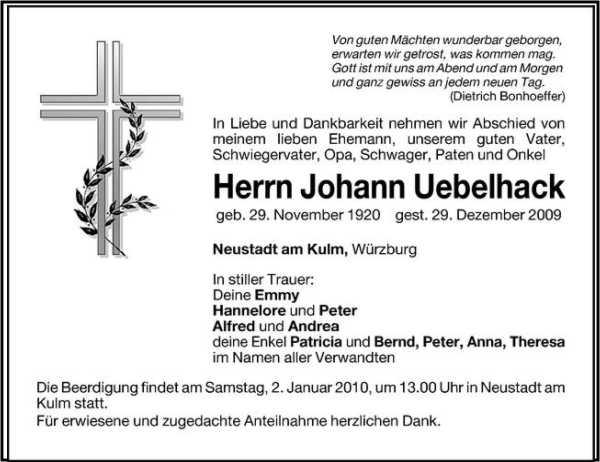 Ich trauere um Hans Uebelhack. Mit ihm habe ich von 1965 bis 1973 als Kirchenvorsteher zusammengearbeitet. Er war ein aufrechter und humorvoller Mensch, der seine Sache als Christ sehr ernst nahm. Bewundert habe ich auch immer seinen Mut, in der Landwirtschaft neue Wege zu gehen. Ich mochte ihn sowohl als Mensch als auch als Kirchenvorsteher sehr gerne und erinnere mich mit guten Gedanken an unsere Zusammenarbeit. Wir sprechen der Familie unser aufrichtiges Beileid aus. Gott möge ihn aufnehmen in sein himmlisches Reich. Ulrich Cronenberg mit Frau Maria