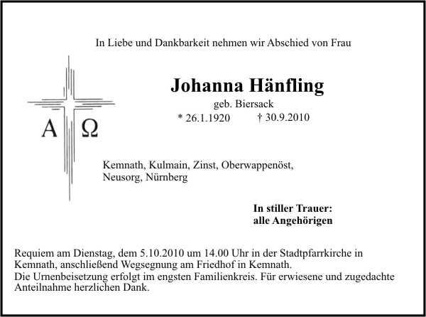 Requiem am Dienstag, 5.10.2010 um 14.00 Uhr in der Stadtpffarrkirche Kemnath, anschließend Wegsegnung auf dem Friedhof.