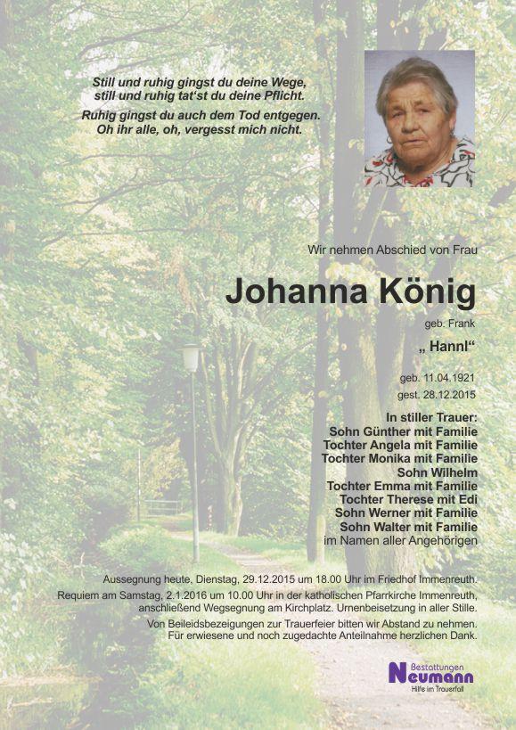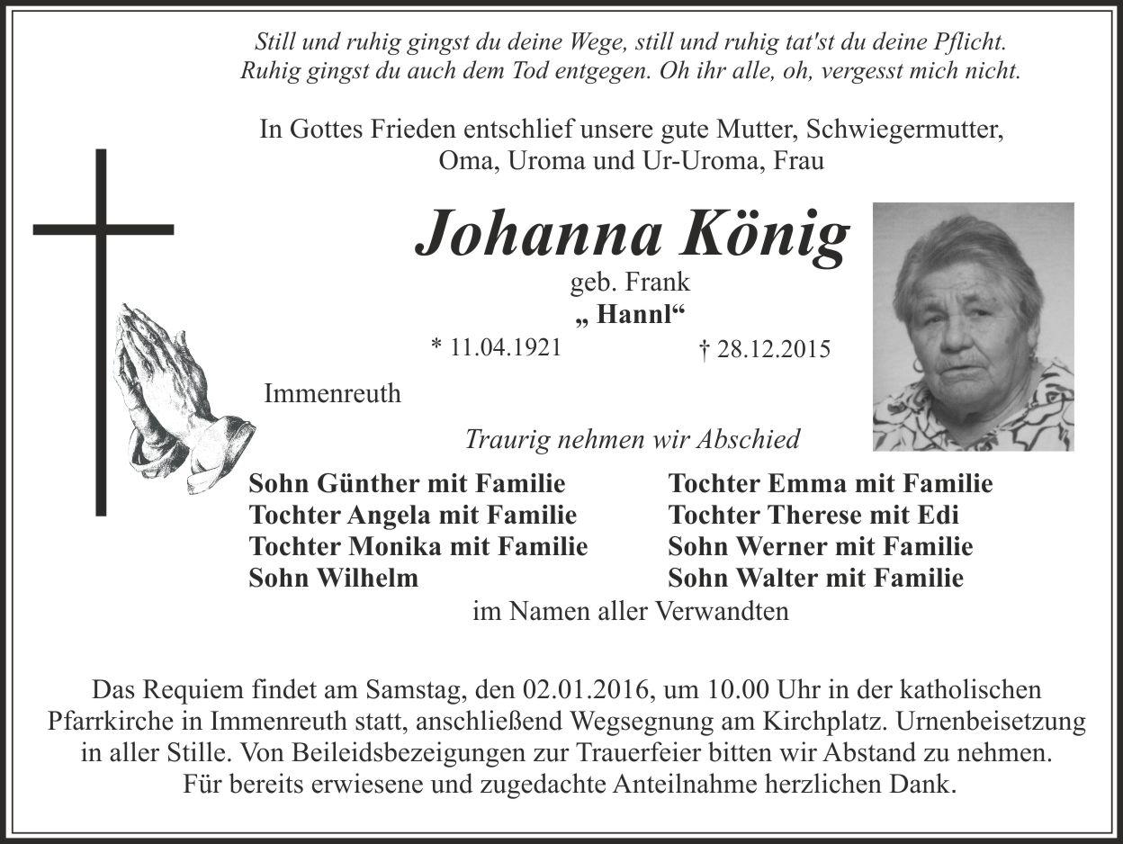 Requiem am Samstag, 2.1.2016 um 10.00 Uhr in der katholischen Pfarrkirche Immenreuth, anschließend Wegsegnung am Kirchplatz. Urnenbeisetzung in aller Stille.