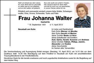 Die Beisetzung findet am Dienstag, 16.04.2013 um 14:30 Uhr auf dem Friedhof in Neustadt am Kulm statt.