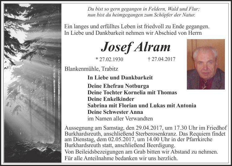 Aussegnung am Samstag, den 29.04.2017, um 17.30 Uhr im Friedhof Burkhardsreuth, anschließend Sterberosenkranz. Das Requiem findet am Dienstag, dem 02.05.2017, um 14.00 Uhr in der Pfarrkirche Burkhardsreuth statt, anschließend Beerdigung.