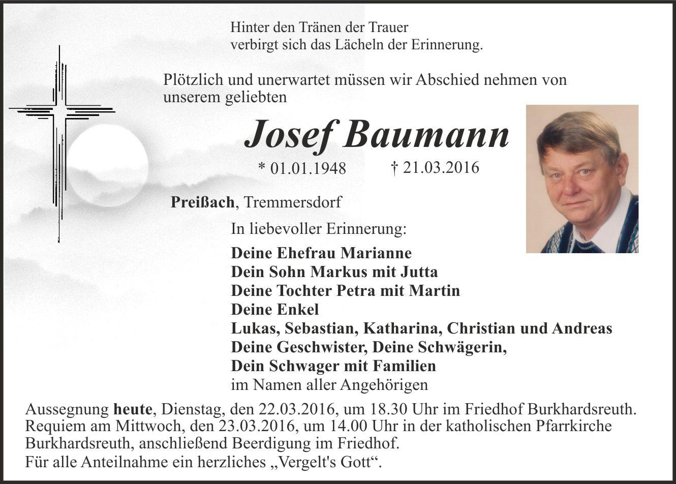 Aussegnung am Dienstag, den 22.03.2016, um 18.30 Uhr im Friedhof Burkhardsreuth. Requiem am Mittwoch, den 23.03.2016, um 14.00 Uhr in der Katholischen Pfarrkirche Burkhardsreuth, anschließend Beerdigung im Friedhof. Für alle Anteilnahme ein herzliches "Vergelt's Gott".
